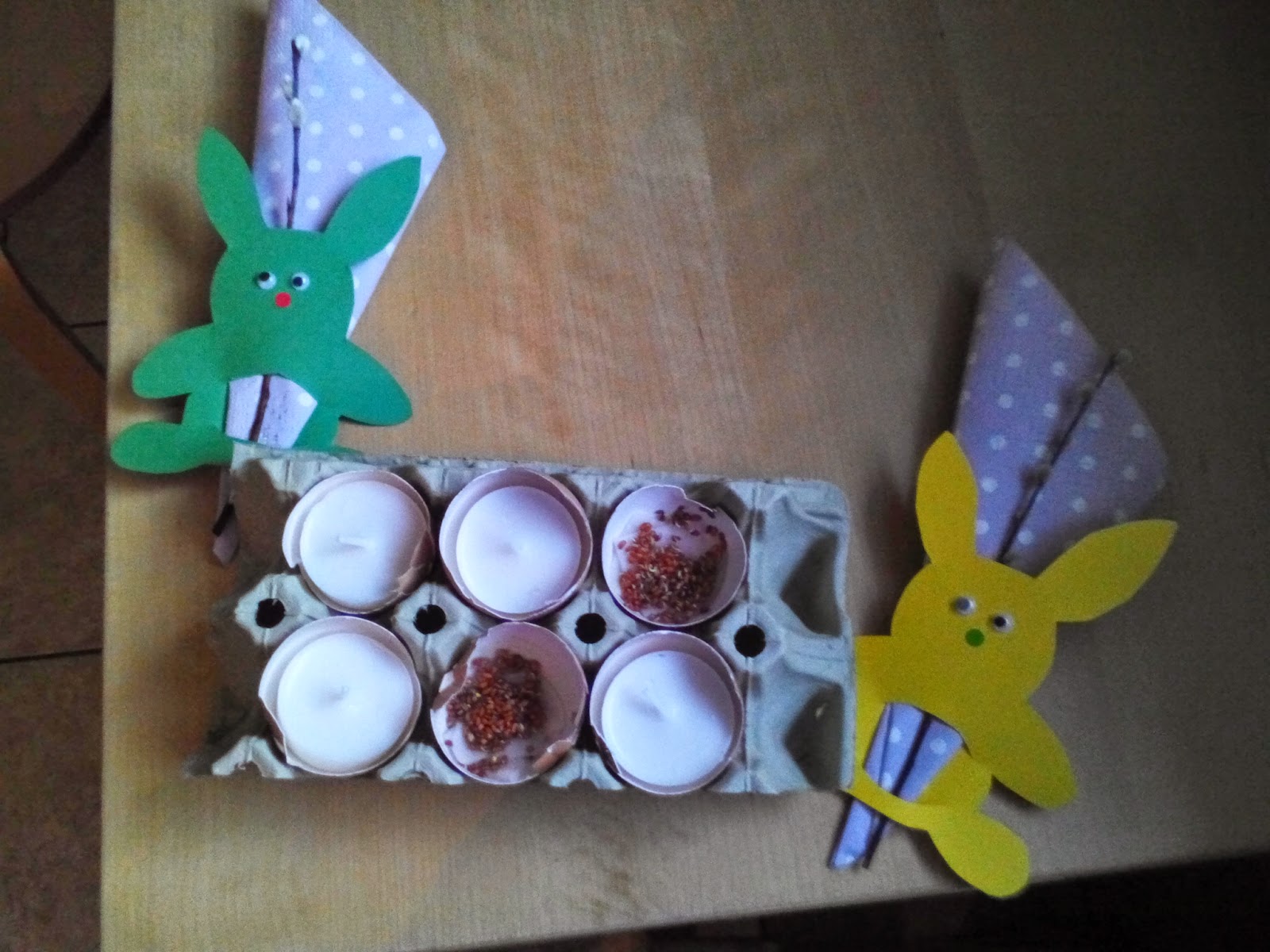 U nas w tym roku stół przyozdobią dwie doniczki w kształcie jajek, wysiane rzeżuchą oraz skorupki po jajkach również z taką zawartością.